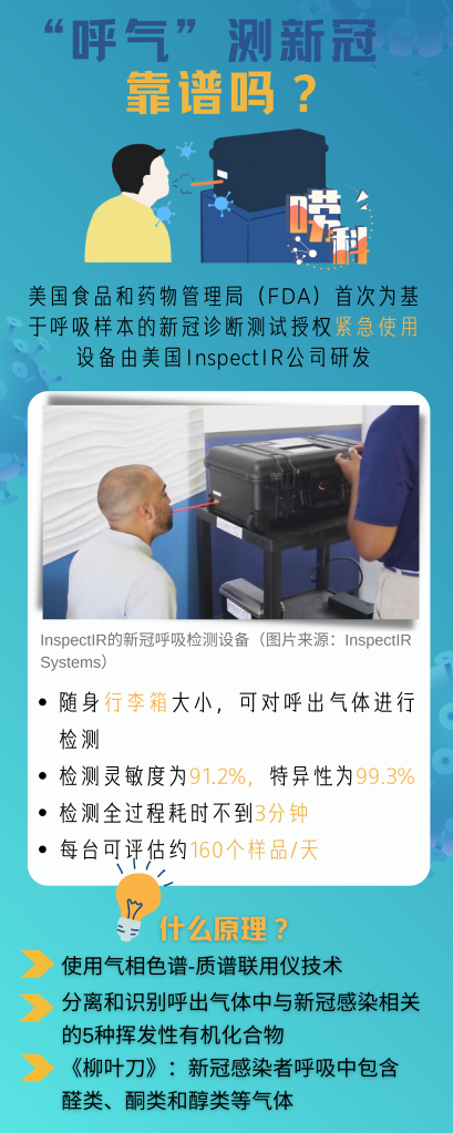 無需再被棉簽捅嗓子或鼻子,只需拿起吸管對(duì)著儀器吹口氣,3分鐘便可得知自己是否感染新冠——近日,美國食品和藥物管理局首次為基于呼吸樣本的新冠診斷測試授權(quán)緊急使用。該測試設(shè)備只有一件隨身行李箱大小,可對(duì)呼出氣體進(jìn)行檢測,比提取鼻咽拭子的PCR核酸檢測更加方便、快速。