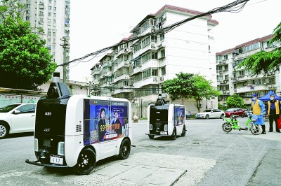 4月25日,無人快遞車行駛在上海市楊浦區長海路街道浣紗小區內。為幫助解決該小區物資配送難題,上海理工大學菜鳥驛站安排了兩臺無人快遞車進駐,將物資配送到居民家門口。新華社記者 張建松攝
