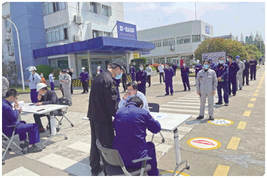 在位于上海市金山區(qū)的巴斯夫護理化學品(上海)有限公司工廠內,工人在做抗原檢測(五月十二日攝)。本報通聯照片