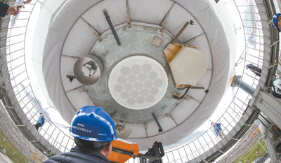 技術(shù)人員對(duì)“中國(guó)天眼”的饋源艙進(jìn)行維護(hù)保養(yǎng)。新華社記者 歐東衢攝