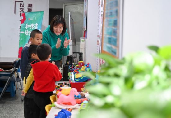 2021年12月4日,張潔(右一)在“村童媽媽聚樂部”教小朋友演唱歌曲《愛的鼓勵》。 新華社記者 林善傳 攝