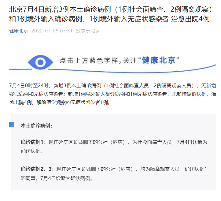 確診病例2、3:現住延慶區長城腳下的公社(酒店),均為隔離觀察人員,確診病例1的同事,7月4日診斷為確診病例。