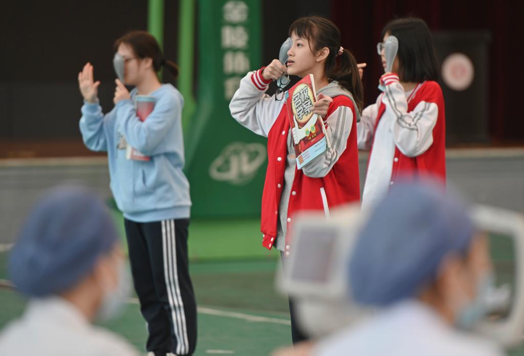 2021年4月28日,在福州第二中學(xué),學(xué)生在視力篩查中辨識(shí)視力表。新華社記者 宋為偉 攝