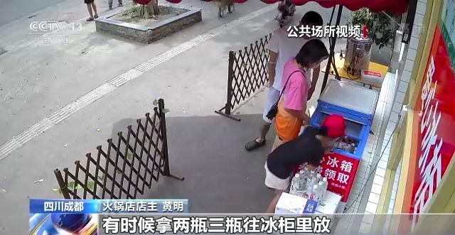 火鍋店店主 黃明:前段時間因為天氣特別熱,成都有40多度,每天要差不多消耗七、八十瓶水,除了環衛工人、快遞小哥,過路的人這些都會來取水。