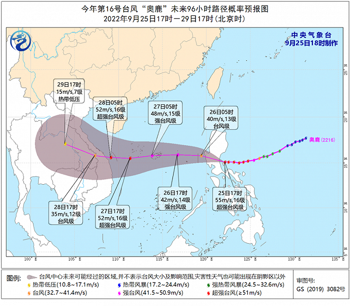 預(yù)計(jì),“奧鹿”將以每小時(shí)25公里左右的速度向西偏北方向移動,將于今天晚上在菲律賓呂宋島東部沿海登陸(48~55米/秒,15~16級,強(qiáng)臺風(fēng)級或超強(qiáng)臺風(fēng)級),今天夜間穿過呂宋島,強(qiáng)度有所減弱,26日早晨到上午進(jìn)入南海中東部海域,之后向偏西方向移動,逐漸向越南東部沿海靠近,強(qiáng)度還將有所加強(qiáng),28日早晨到上午在越南東部沿海登陸(48~52米/秒,15~16級,強(qiáng)臺風(fēng)級或超強(qiáng)臺風(fēng)級),登陸后強(qiáng)度快速減弱。中央氣象臺9月25日上午發(fā)布臺風(fēng)藍(lán)色預(yù)警。