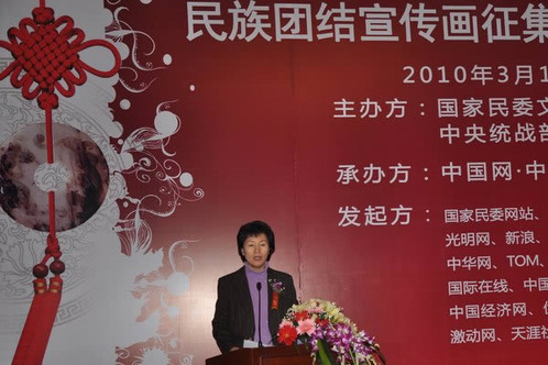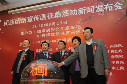 為貫徹落實中共中央辦公廳、國務院辦公廳《關于深入開展民族團結宣傳教育活動的意見》精神,向社會提供主題鮮明、健康向上、反映時代風貌、準確權威的民族團結宣傳品,展示我國各民族共同團結奮斗、共同繁榮發展的時代風貌,由國家民委文化宣傳司、中央統戰部民族宗教局主辦,中宣部宣教局支持,中國網中國民族頻道承辦,國家民委網站、中國民族宗教網、人民網、中新網、中國網,光明網、中國文明網、中華網、TOM、中國經濟網、國際在線、中青在線、中青網,央視網、中國廣播網、鳳凰網、中國經濟新聞網、網易、新浪網、騰訊、搜狐、千龍網、優酷網、酷六網、貓撲網,激動網、中工網、天涯社區、環球網、中國日報網、和訊網,中國企業新聞網,北青網等共同發起宣傳的民族團結宣傳畫征集活動新聞發布會于2010年3月19日下午在北京國家民族事務委員會舉行,國家民委副主任丹珠昂奔及國家民委、中央宣傳部、中央統戰部有關部門的同志出席了新聞發布會。
