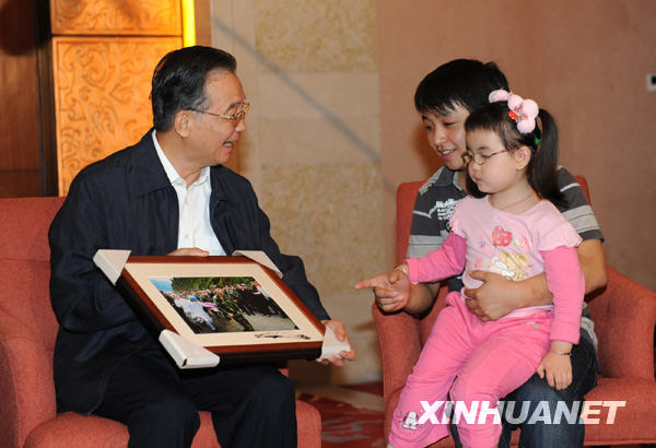 9月25日,中共中央政治局常委、國(guó)務(wù)院總理溫家寶在綿陽(yáng)邀請(qǐng)四川地震災(zāi)區(qū)部分基層干部群眾會(huì)面。這是溫家寶拿著照片,向4歲的宋馨懿(右)講述他在北川縣城外為剛剛獲救的小馨懿讓路的情景。新華社記者黃敬文攝