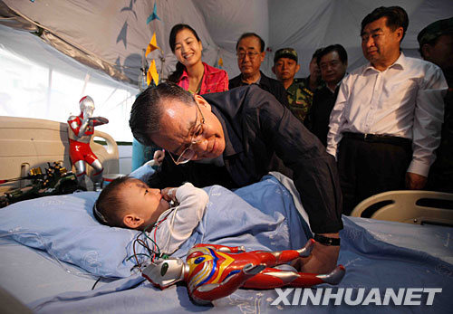 資料圖片 2008年5月23日,中共中央政治局常委、國(guó)務(wù)院總理、國(guó)務(wù)院抗震救災(zāi)總指揮部總指揮溫家寶前往四川綿陽(yáng)404醫(yī)院看望受傷群眾。這是溫家寶在監(jiān)護(hù)室看望在地震中受傷的小朋友郎錚。 新華社記者 姚大偉攝