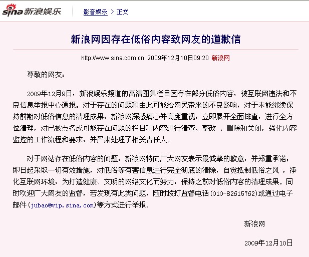 2009年12月9日,新浪娛樂頻道的高清圖集欄目因存在部分低俗內(nèi)容,被互聯(lián)網(wǎng)違法和不良信息舉報(bào)中心通報(bào)。對于存在的問題和由此可能給網(wǎng)民帶來的不良影響,對于未能繼續(xù)保持前期對低俗信息的清理成果,新浪網(wǎng)深感痛心并高度重視,立即展開全面排查,進(jìn)行全方位清理,對已被點(diǎn)名或可能存在問題的欄目和內(nèi)容進(jìn)行清查、整改 、刪除和關(guān)閉,強(qiáng)化內(nèi)容監(jiān)控的工作流程和要求,并嚴(yán)肅處理了相關(guān)責(zé)任人。