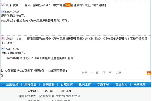 記者日前在瀏覽國務院法制辦網站時發現,在該網站“在線互動”欄目的“留言板”中,回復網民“余先生”“余地”所提的“物權法生效后《拆遷條例》是否廢止”的問題時,稱:“2001年6月13日發布的《城市房屋拆遷管理條例》有效。”