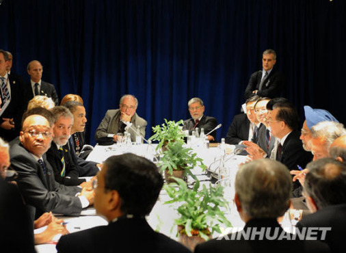 12月18日,國務院總理溫家寶在哥本哈根與巴西總統(tǒng)盧拉、南非總統(tǒng)祖馬、印度總理辛格“基礎(chǔ)四國”領(lǐng)導人一起與美國總統(tǒng)奧巴馬就聯(lián)合國氣候變化大會達成最后協(xié)議進行磋商。新華社記者劉建生攝