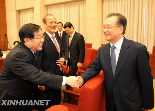1月29日,溫家寶主持召開座談會,聽取各民主黨派中央、全國工商聯負責人和無黨派人士代表對《政府工作報告》的意見。這是溫家寶與出席座談會的代表握手。1月22日至2月1日,國務院總理溫家寶在北京中南海主持召開五次座談會,征求對即將提請十一屆全國人大三次會議審議的《政府工作報告》的意見。新華社記者 劉建生 攝