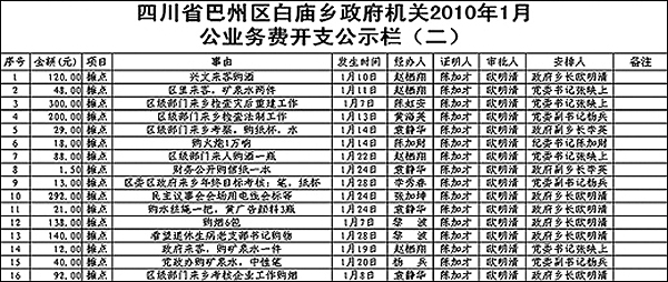 張映上表示,70%的白廟鄉(xiāng)群眾在外打工,因此,賬務(wù)信息首先要讓他們知道。在記者向他提出這一疑問后的第二天,1月份公務(wù)開支明細(xì)已經(jīng)被貼在了鄉(xiāng)政府門口的財(cái)務(wù)公示欄上。