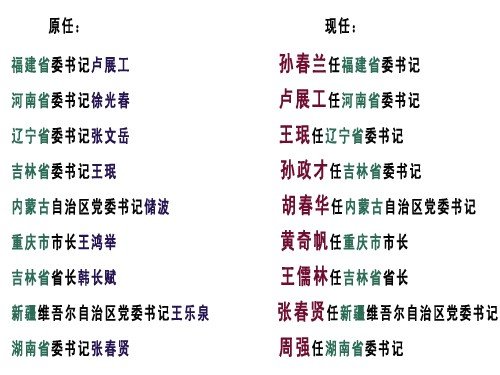 2009年11月至2010年4月六個月時間內(nèi),全國先后有八個省市區(qū)黨政主要負責同志出現(xiàn)調整,其中福建、河南、遼寧、內(nèi)蒙古、新疆、湖南調整了省(區(qū))黨委書記,重慶市更換市長,吉林省則省委書記、省長兩職均發(fā)生變化。