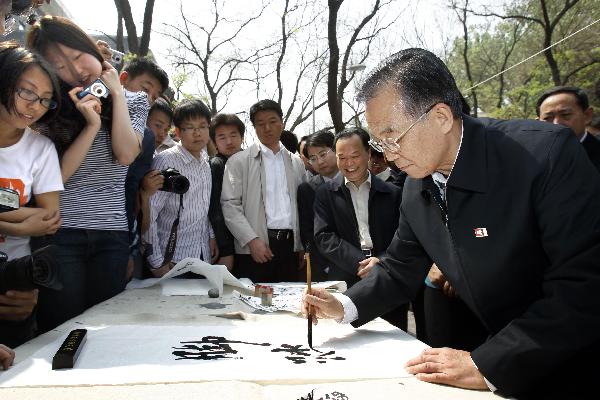 上午9時(shí)55分,溫家寶在北京大學(xué)南門(mén)外下車,步行走進(jìn)學(xué)校。五四大道兩旁,學(xué)生們正在舉辦著“五四”青年節(jié)文化季活動(dòng)。看到總理來(lái)到了校園,年輕學(xué)子們臉上洋溢著活力四射的青春光彩。他們不斷鼓掌、歡呼,表達(dá)著激動(dòng)的心情……