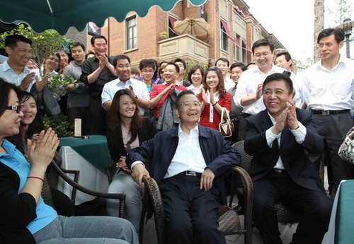 5月13日至14日,中共中央政治局常委、國務(wù)院總理溫家寶在天津調(diào)研。這是5月14日,溫家寶來到海河意式風(fēng)情區(qū),與在這里休閑的游客親切交談。新華社記者 劉衛(wèi)兵 攝(新華網(wǎng))