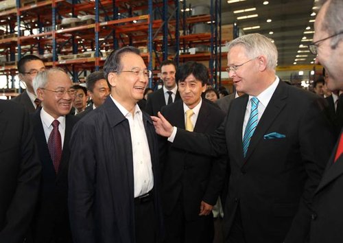 5月13日至14日,中共中央政治局常委、國務(wù)院總理溫家寶在天津調(diào)研。這是5月14日,溫家寶在西門子電氣傳動有限公司考察時與外方負(fù)責(zé)人交談。 新華社記者 劉衛(wèi)兵 攝