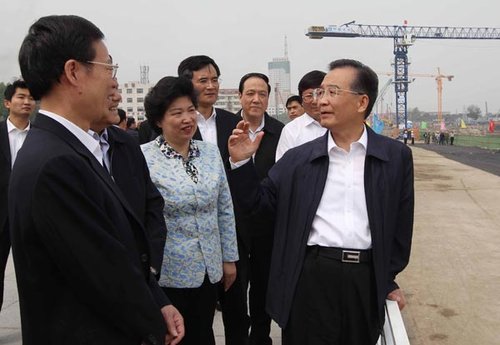 5月13日至14日,中共中央政治局常委、國務(wù)院總理溫家寶在天津調(diào)研。這是5月14日,溫家寶來到正在建設(shè)中的天津西站綜合交通樞紐工程工地,了解工程建設(shè)情況。 新華社記者 劉衛(wèi)兵 攝