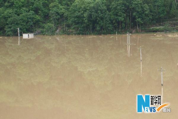 5月18日,貴州省德江縣穩坪鎮海溪溝,大水快要將電線桿淹沒。新華社發