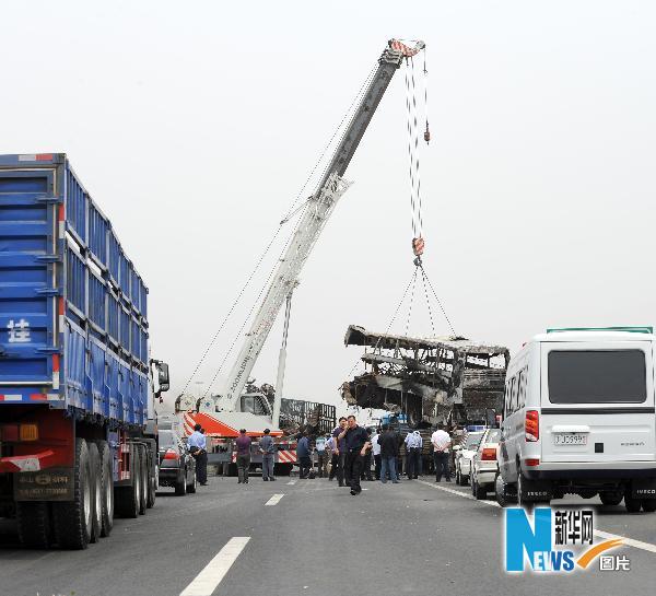5月23日3時左右長深高速公路遼寧境內(nèi)發(fā)生一起特大交通事故,一輛大貨車因方向辨別錯誤,逆向行駛,與一輛正常行駛豪華臥鋪大客車相撞起火,截至目前已經(jīng)造成32人死亡,21人受傷。這是搶救人員在交通事故現(xiàn)場進行事故處置。新華社記者 李鋼攝