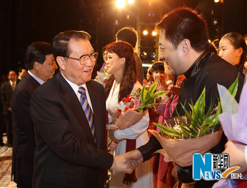 6月11日晚,由北京大學(xué)歌劇研究院與中國(guó)歌劇舞劇院聯(lián)合推出的大型原創(chuàng)歌劇《青春之歌》在國(guó)家大劇院上演,中共中央政治局常委李長(zhǎng)春出席觀看。這是演出結(jié)束后,李長(zhǎng)春與演員親切握手。新華社記者 劉衛(wèi)兵 攝