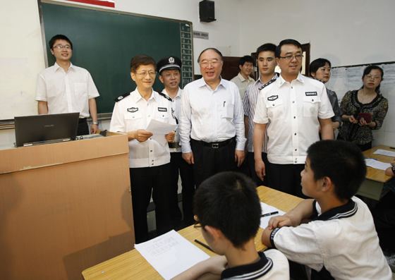 6月10日至11日,國(guó)務(wù)委員、公安部部長(zhǎng)孟建柱在重慶調(diào)研。圖為孟建柱來(lái)到重慶市求精中學(xué)檢查指導(dǎo)校園安保工作。
