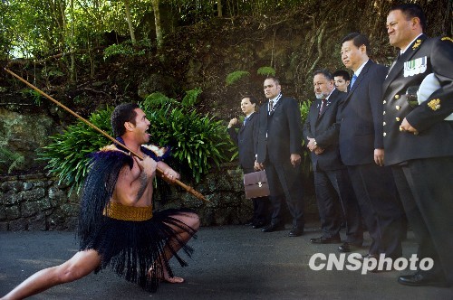 國(guó)家副主席習(xí)近平于當(dāng)?shù)貢r(shí)間6月17日抵達(dá)奧克蘭,開(kāi)始對(duì)新西蘭進(jìn)行正式訪問(wèn)。圖為在奧克蘭總督府,新西蘭方以毛利人傳統(tǒng)儀式迎接習(xí)近平一行。 中新社發(fā) 胡旭君 攝