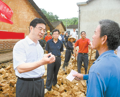 在一處廢墟上,村里的黨員干部正帶領村民們幫助倒房戶清理倒塌的房屋。周強走到大伙中間,同大家詳細交談,充分肯定農(nóng)村基層黨支部和廣大黨員在抗洪搶險和災后重建中發(fā)揮的突出作用,同大家一道商量如何帶領受災群眾,盡快開展災后重建、救災補損。一位老支書說,村里水利基礎設施在洪水中損毀嚴重,這一塊應該是災后重建的重點。周強立刻接過話頭說,我們想到一塊了。