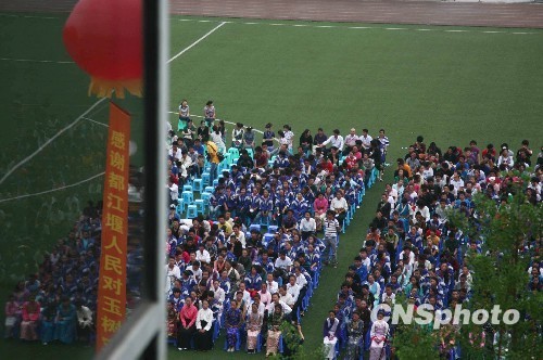 記者7月1日上午來到都江堰八一聚源中學,1200余名師生在這里舉行了“玉樹州民族中學復課儀式”暨開學典禮。學校從當日起正式復課,在短暫的心理疏通輔導后,開始正常教學。