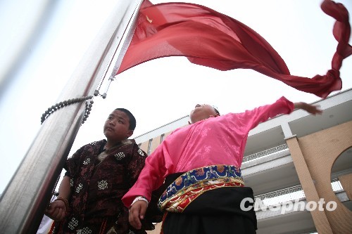 7月1日,來自玉樹藏族自治州民族中學的1200余名師生在都江堰八一聚源高級中學舉行開學典禮和升旗儀式,并正式復課,這群來自玉樹災區首批異地復課的師生在6月28日至30日分三批乘坐火車抵達四川,將在這里度過至少兩年的學習生活。圖為玉樹災區學生在都江堰八一聚源高級中學升五星紅旗。 中新社發 張浪