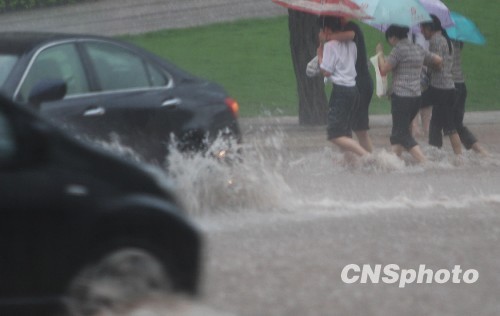 7月9日上午9時許,一場強降雨襲擊重慶主城,不少馬路路面很快出現積水。圖為幾名行人脫下鞋子卷起褲腿互相攙扶過馬路猶如過河。中新社發 郭晉嘉 攝