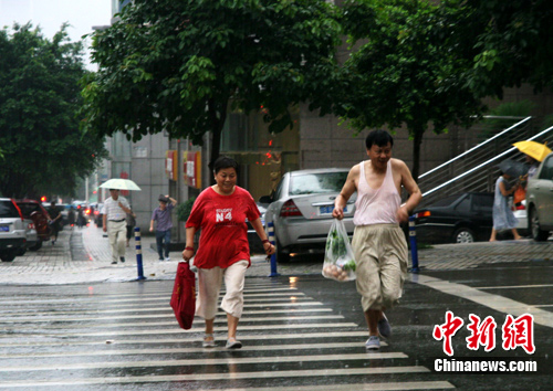 沒有攜帶雨具的行人奔跑尋找躲雨處。 孟幻 攝