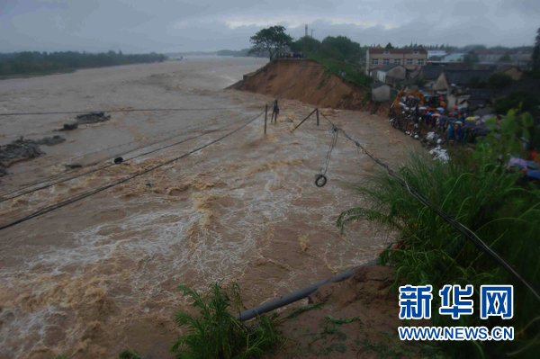 安徽省桐城市大沙河青草段發生崩岸的現場(2010年7月11日攝)。連日來,安徽桐城市遭受歷史罕見的特大暴雨襲擊。11日上午10時,桐城市大沙河青草段發生決堤,武警安慶市支隊110名官兵火速趕赴現場,努力填堵缺口。新華社發(廖福安 攝)