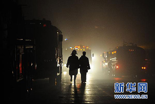 7月16日,大連新港輸油管道爆炸現(xiàn)場(chǎng)的滅火車(chē)輛。李鋼 攝