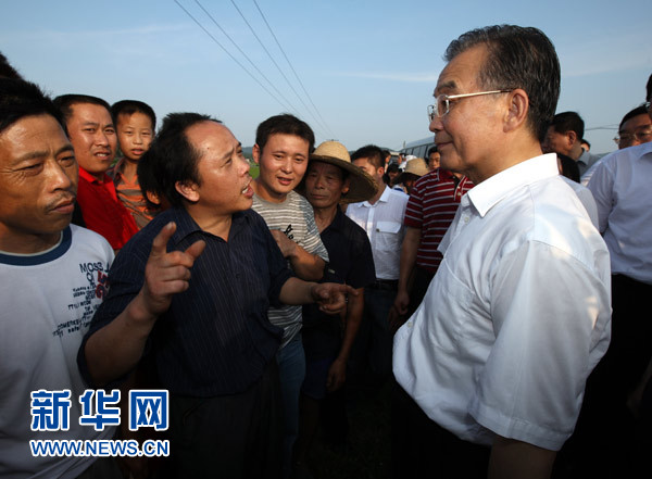 7月1日下午,中共中央政治局常委、國務院總理溫家寶來到湖南考察防汛抗洪工作。圖為陳凱旋擠到總理面前說:“溫總理,我向您反映一個問題!毙氯A社記者姚大偉攝