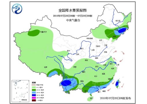 28日08時至29日08時,新疆中南部、西藏大部、青海中南部和西部、甘肅東南部、陜西南部、內蒙古中部、東北南部和東部、華北北部、江淮大部、江漢、江南、華南、西南大部等地有小到中雨或陣雨,其中,吉林中東部和南部、遼寧北部、西藏東南部、川西高原東南部、云南大部、廣西東部、廣東中南部、福建東部、臺灣大部等地有大雨或暴雨;上述局地并伴有短時雷雨大風等強對流天氣。新疆東部、內蒙古大部、東北東部等地有4~6級風。受入海氣旋和西南季風的共同影響,黃海南部將有9級大風,陣風可達10級;東海南部、臺灣海峽將有7~8級大風,陣風可達9級;黃海中部、南海北部將有5~7級風。