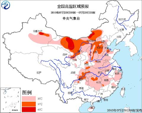 中央氣象臺7月29日06時繼續發布高溫黃色預警: