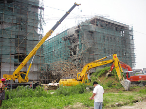29日上午10點30分左右,(江蘇)泰州市開發(fā)區(qū)寺巷鎮(zhèn)標(biāo)準(zhǔn)廠房區(qū)建筑工地發(fā)生一起慘烈事故:一座距離地面20多米高、架設(shè)在兩幢樓之間的“天橋”,在澆筑過程中突然坍塌,從高空砸下的混凝土和鋼管腳手架將正在施工的5名工人活埋。截至記者發(fā)稿時,救援人員已經(jīng)從廢墟中扒出4人,其中3人身亡。目前,混凝土和鋼管下還埋有一人。救援還在緊張進行中。