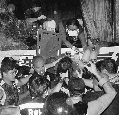 8月23日,在菲律賓首都馬尼拉,醫護人員將劫持事件中受傷的人員抬下客車。新華社發