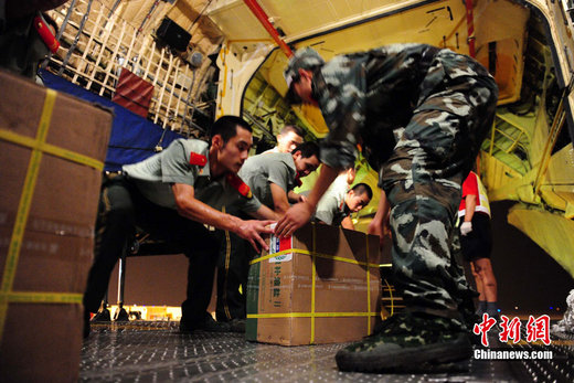 8月3日深夜,中國政府緊急援助巴基斯坦人道主義物資在河北省石家莊機場連夜裝機,準備于4日通過中國空軍飛機運往伊斯蘭堡。這批物資包括30噸藥品和凈水設備、1000頂帳篷、50臺發電機等,總價值約1000萬元人民幣。 中新社發 侯宇 攝