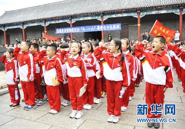 9月17日,長春市西五小學的同學們莊嚴宣誓。當日,來自吉林省公安廳警衛局的戰士以及長春市婦女兒童活動中心的農民工子女、長春市西五小學、長春市103中學等學校的學生共1000余人,來到偽滿皇宮博物院熙緝樓“九·一八”紀念碑前,莊嚴宣誓:“不忘‘九·一八’血雨腥風,弘揚先烈愛國之情,緬懷英烈報國之志,恪守革命遺志!” 新華社記者 肖瀟 攝
