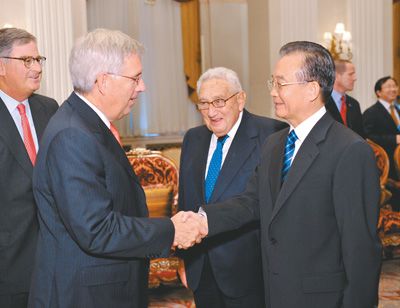 溫家寶指出,中美在政治上合則兩利,斗則俱傷;在經(jīng)濟(jì)上,已經(jīng)到了誰(shuí)也離不開誰(shuí)的地步。中美之間的共同利益遠(yuǎn)遠(yuǎn)大于分歧。目前雙邊關(guān)系中面臨的一些矛盾,是發(fā)展中出現(xiàn)的問(wèn)題,要通過(guò)對(duì)話合作加以解決。中美要做合作伙伴,而不是競(jìng)爭(zhēng)對(duì)手。一個(gè)強(qiáng)大穩(wěn)定的中國(guó)對(duì)美國(guó)和世界有利,中國(guó)也希望美國(guó)保持強(qiáng)大穩(wěn)定。