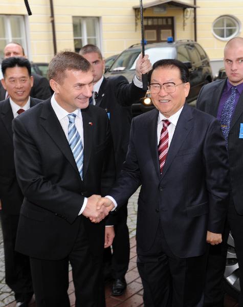 當地時間9月21日,中共中央政治局常委李長春在塔林會見愛沙尼亞總理、改革黨主席安德魯斯·安西普。 新華社記者 馬占成 攝