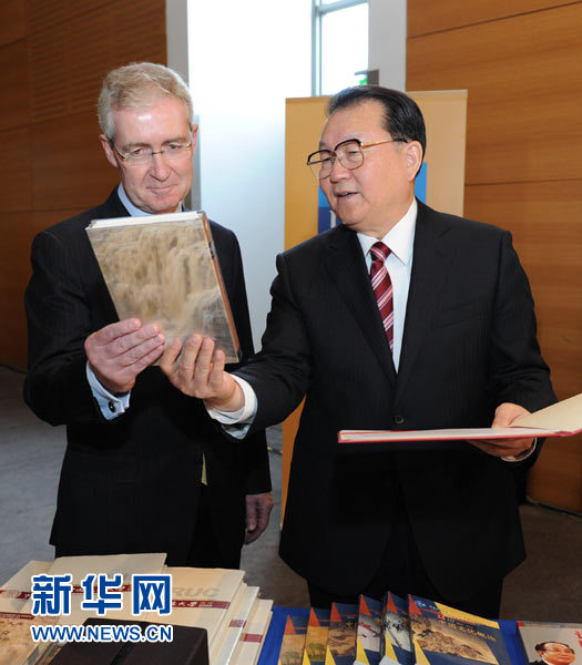 9月26日,正在愛爾蘭進行正式友好訪問的中共中央政治局常委李長春向都柏林孔子學院贈送孔子銅像和書籍。這是李長春(右)向都柏林大學校長布雷迪贈送中國圖書。 新華社記者 馬占成 攝