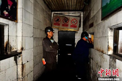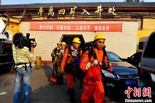 10月16日早晨6點左右,河南平煤集團平禹四礦發生瓦斯突出事故,采面風巷瓦斯濃度超過40%。圖為入井口搶險礦工。中新社發 關濤 攝