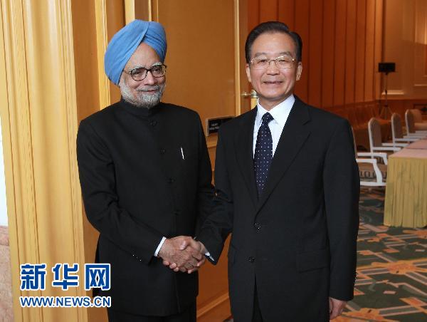 10月29日,正在越南首都河內出席東亞領導人系列會議的中國國務院總理溫家寶在下榻的酒店會見印度總理辛格。 新華社記者 龐興雷 攝