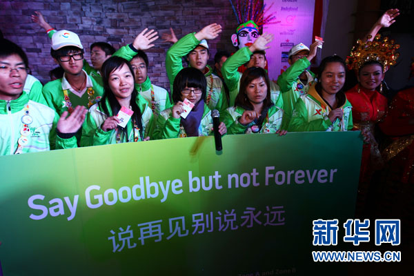 10月28日,在上海世博園印度尼西亞館,志愿者代表在惜別會上合唱《朋友》。當天,上海世博園A、B片區的志愿者代表在印尼館參加“說再見別說永遠”的志愿者惜別會。上海世博會即將于10月31日閉幕,他們將告別這片傾注了熱情與汗水的園地。新華社記者劉彬攝