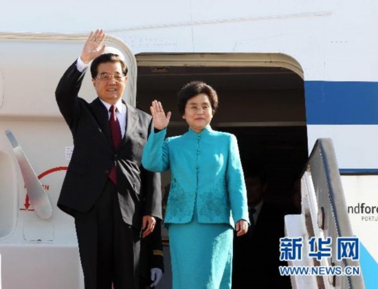 11月6日,中國國家主席胡錦濤乘專機抵達里斯本,開始對葡萄牙進行國事訪問。這是胡錦濤和夫人劉永清在機場向歡迎人群招手致意。新華社記者蘭紅光攝