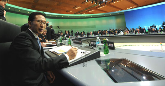 11月12日,韓國總統李明博(左)主持二十國集團首爾峰會全體會議。當日,二十國集團第五次峰會第一次全會在韓國首爾正式召開,會議將關注全球經濟合作和推動世界經濟持續復蘇等重大議題。 新華社發