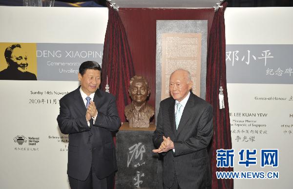 11月14日,正在新加坡訪問的國家副主席習近平與新加坡內閣資政李光耀共同出席在新加坡河畔舉行的鄧小平紀念碑揭幕儀式。新華社記者黃敬文攝